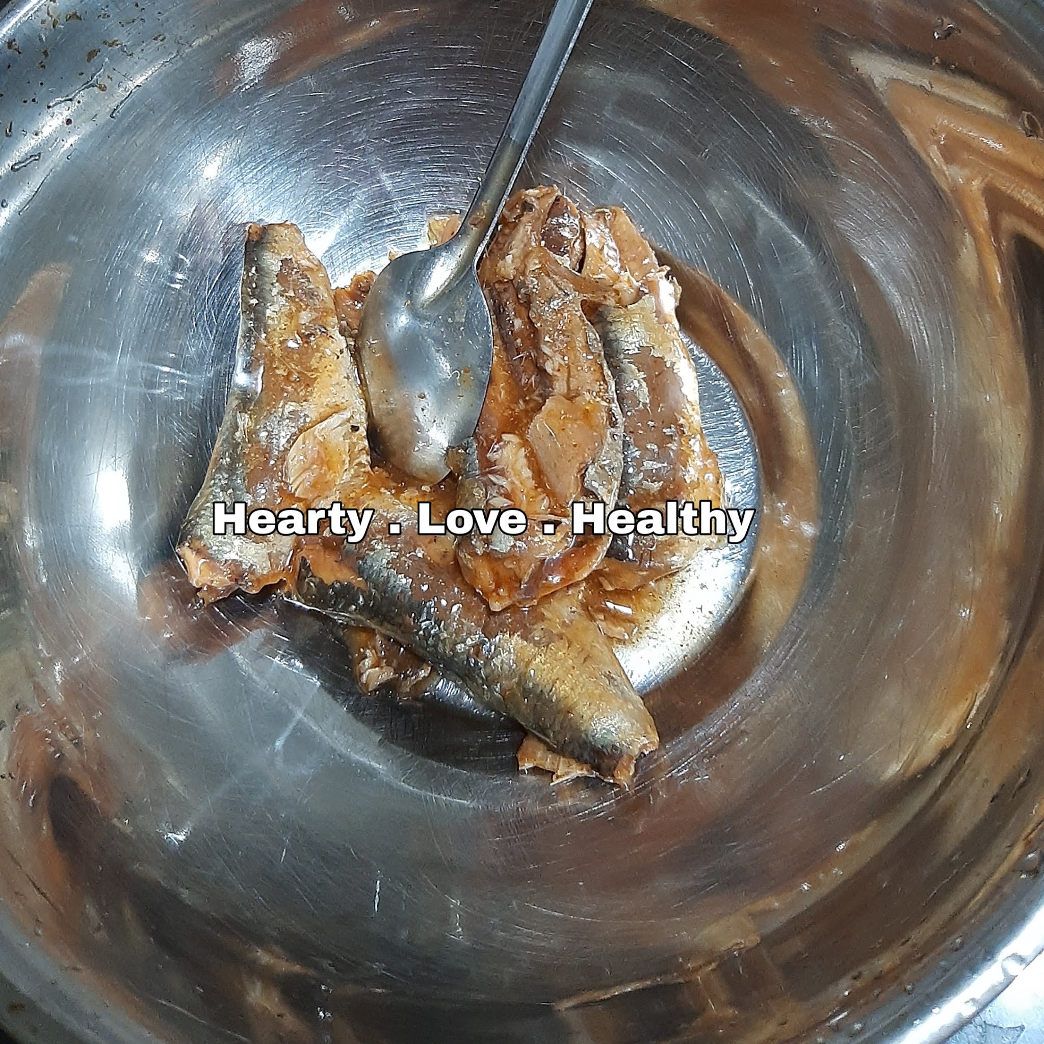 3. Kacau adunan bawang dan sardin. Sebatikan ia.